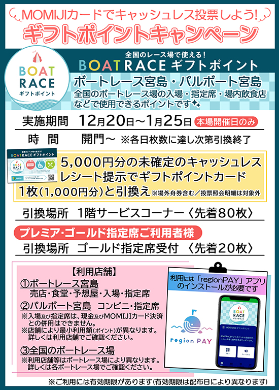 「ギフトポイント」とは地域通貨アプリ「Region Pay」を通して、ボートレース宮島・パルボート宮島内などで使用できるポイントです。