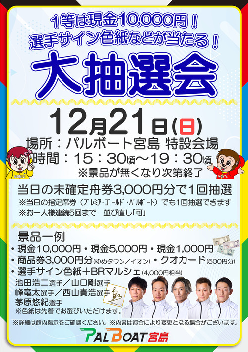 1等は現金10,000円! 選手サイン色紙などが当たる大抽選会を開催いたします! 時間、場所、景品等は下記画像からご確認ください。