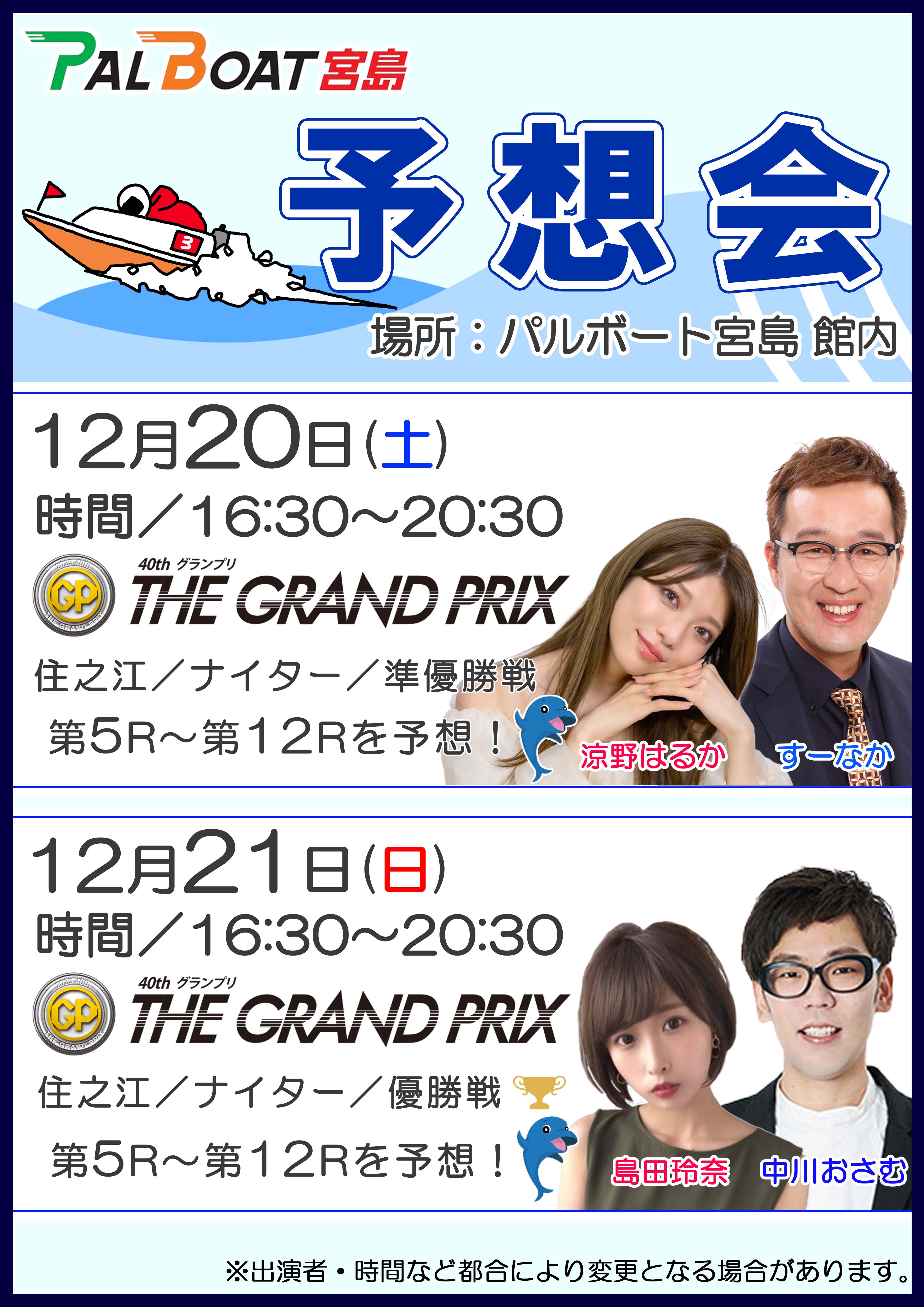 場所:PALBOAT宮島館内 ●12/20(土) 時間:16:30~20:30 出演者:すーなか、涼野はるか ●12/21(日) 時間:16:30~20:30 出演者:中川おさむ、島田玲奈