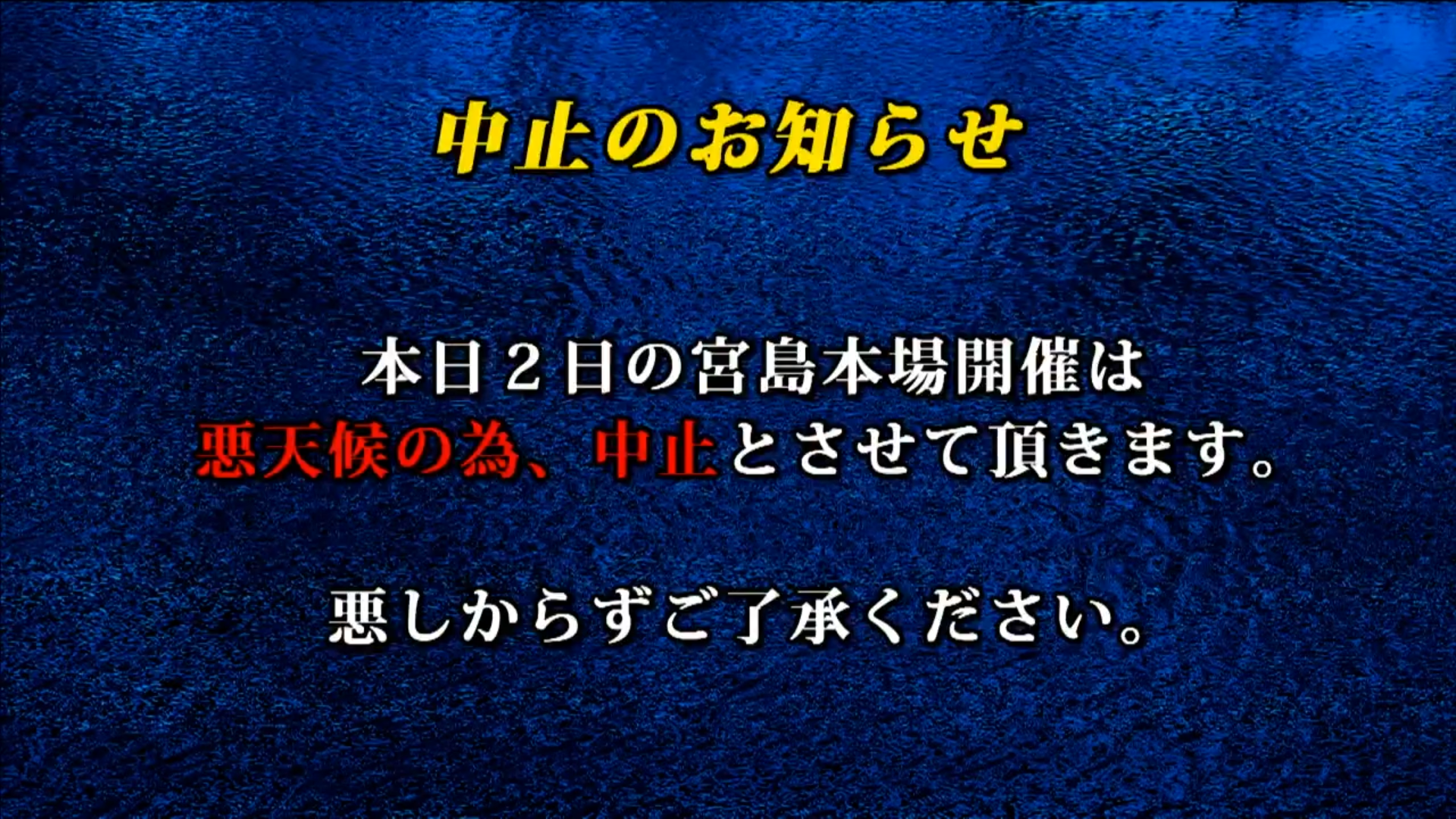 1月2日(金)の ボートレース宮島「第52回日刊スポーツ栄光楯 新春広島ダービー」4日目第12Rは、 悪天候(降雪による視界不良)のため【中止】とさせていただきます。 なお、前売りにて発売しました第12レースの舟券はすべて返還となります。 また、パルボート宮島の場外発売は予定通り実施いたします。 ファンの皆様には、大変ご迷惑をおかけしますが、 何卒ご理解を賜りますようお願い申しあげます。