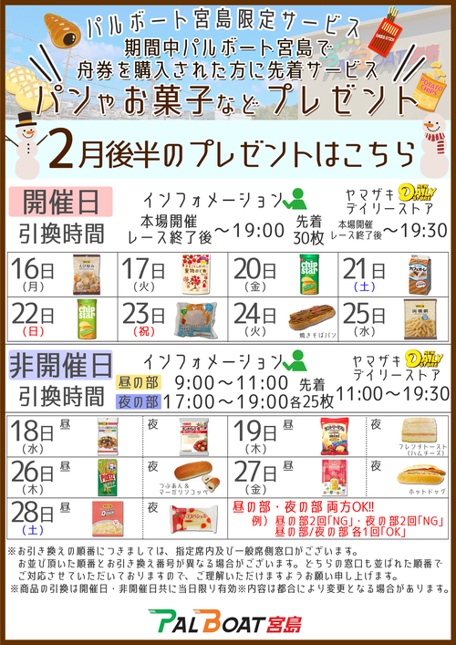 期間中パルボート宮島で舟券を購入された方に先着でパンやお菓子などをプレゼントいたします。 期間:2025年4月1日(火)~2026年3月31日(火) 条件・引換方法・引換場所や時間など詳しくは下記画像をご確認くださいませ。