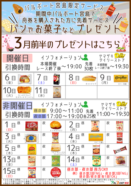 期間中パルボート宮島で舟券を購入された方に先着でパンやお菓子などをプレゼントいたします。 期間:2025年4月1日(火)~2026年3月31日(火) 条件・引換方法・引換場所や時間など詳しくは下記画像をご確認くださいませ。