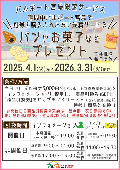 期間中パルボート宮島で舟券を購入された方に先着でパンやお菓子などをプレゼントいたします。 期間:2025年4月1日(火)~2026年3月31日(火) 条件・引換方法・引換場所や時間など詳しくは下記画像をご確認くださいませ。