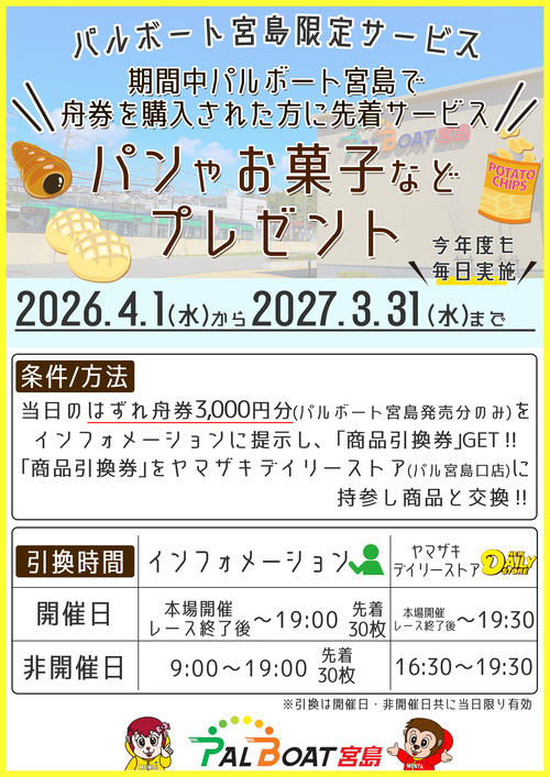 期間中パルボート宮島で舟券を購入された方に先着でパンやお菓子などをプレゼントいたします。 期間:2026年4月1日(水)~2027年3月31日(水) 条件・引換方法・引換場所や時間など詳しくは下記画像をご確認くださいませ。